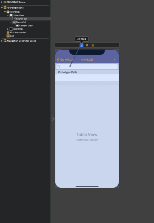 이후에 검색상자를 그 위에 추가할 때 반드시 아래 사진처럼 Search Bar와 ViewController를 연결해주어야 한다.