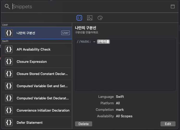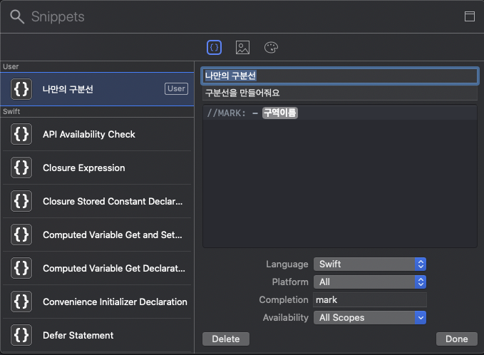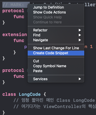 1. "//MARK : -"만 블록설정한다. 2. 우클릭하고 Create Code Snippet으로 들어간다. 이는 우리가 평소 자주 보는 자동완성을 스스로 만드는 기능이다. |
